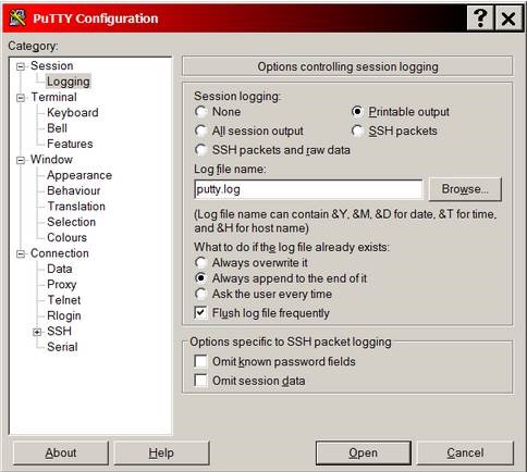 - Set ‘Log file name’ to ‘&Y&M&D_%T_ _putty.log’ (or, whatever you like).